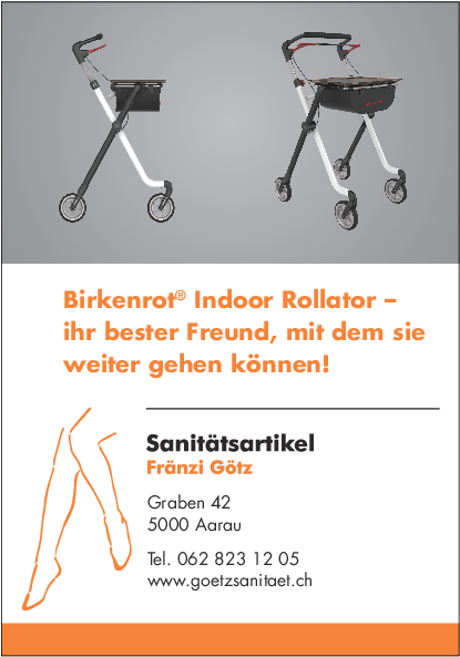 Im Alter werden Gehhilfen oft zu wichtigen Unterstützern für das tägliche Leben. Im Sanitätsartikelgeschäft von Fränzi Götz gibt es eine grosse Auswahl an Rollatoren und Gehstöcken. Der Birkenrot-Rollator Athlon ist ein Extrem-Leichtgewicht, welcher sich mit einem Handgriff schnell und simpel zusammenfalten lässt. Ausgestattet mit einer grossen Tasche und vielen praktischen Funktionen wie zum Beispiel höhenverstellbaren, ergonomischen Griffen und einer Gehhilfenhalterung bietet er eine ideale Unterstützung beim Gehen und ermöglicht viele aktive sowie selbstständige Spaziergänge und Einkäufe. Dazu sind Zubehörprodukte wie der feste Sitz, ein Ablagetablett oder wasserdichte Taschen erhältlich. Gehhilfen sind auch Vertrauenssache und deshalb setzt das Team von Fränzi Götz auf umfassende und persönliche Beratung.
